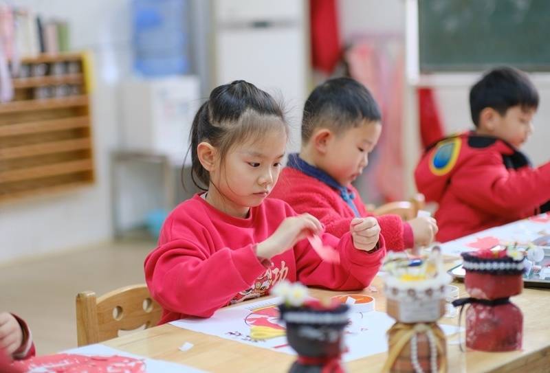 老师正陪伴孩子们做手工。