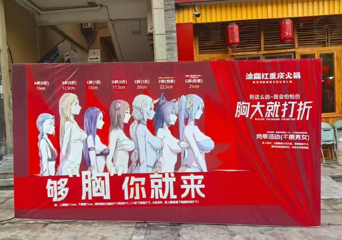 大皖新闻讯9月4日上午杭州网上配资,一张涉嫌低俗内容的广告在社交平台引发关注,该广告牌在显眼位置写有“够‘胸’你就来”的字样,广告中央印有穿着暴露的女性动漫形象,且不同人物上方还标注“A杯(9折)10cm、B杯(8折)15cm……G杯(免单)25cm”的字样,而在广告牌右侧还备注“胸大就打折”。大皖新闻记者注意到广告上还提到涉事商家名称为“渝某红重庆火锅”。