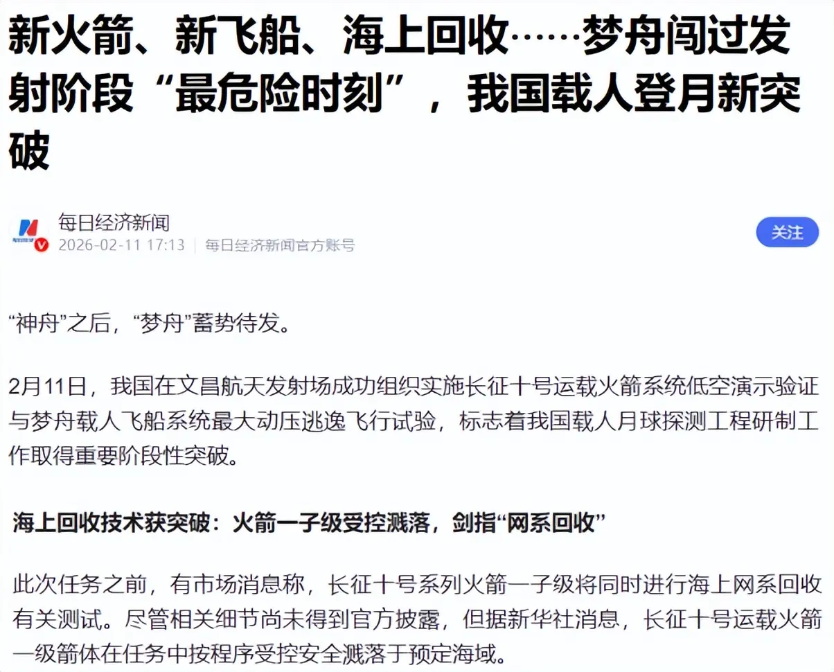 2月11日,我国在文昌航天发射场成功组织实施长征十号运载火箭系统低空演示验证与梦舟载人飞船系统最大动压逃逸飞行试验,有市场消息称,长征十号系列火箭一子级将同时进行海上网系回收有关测试。